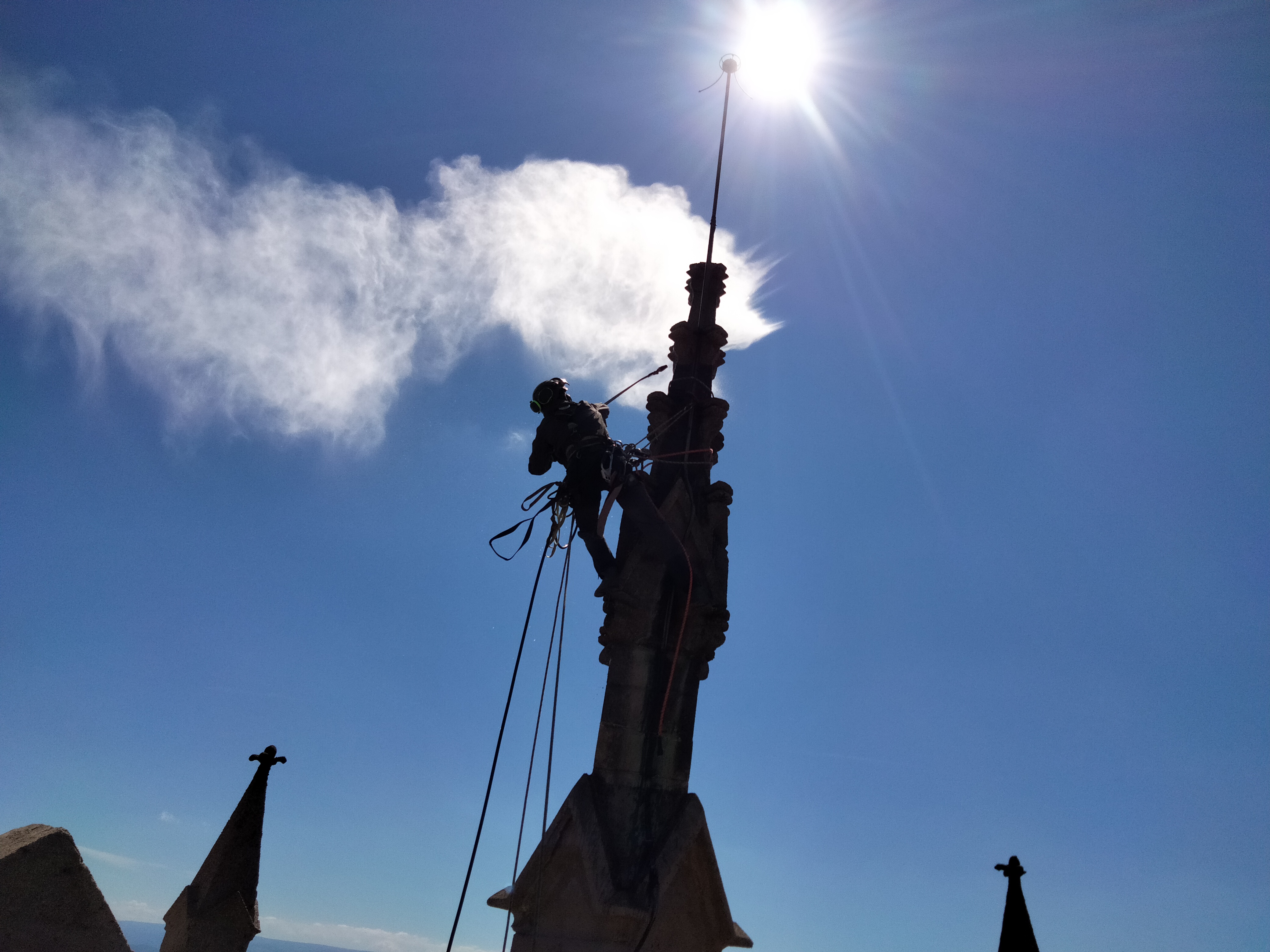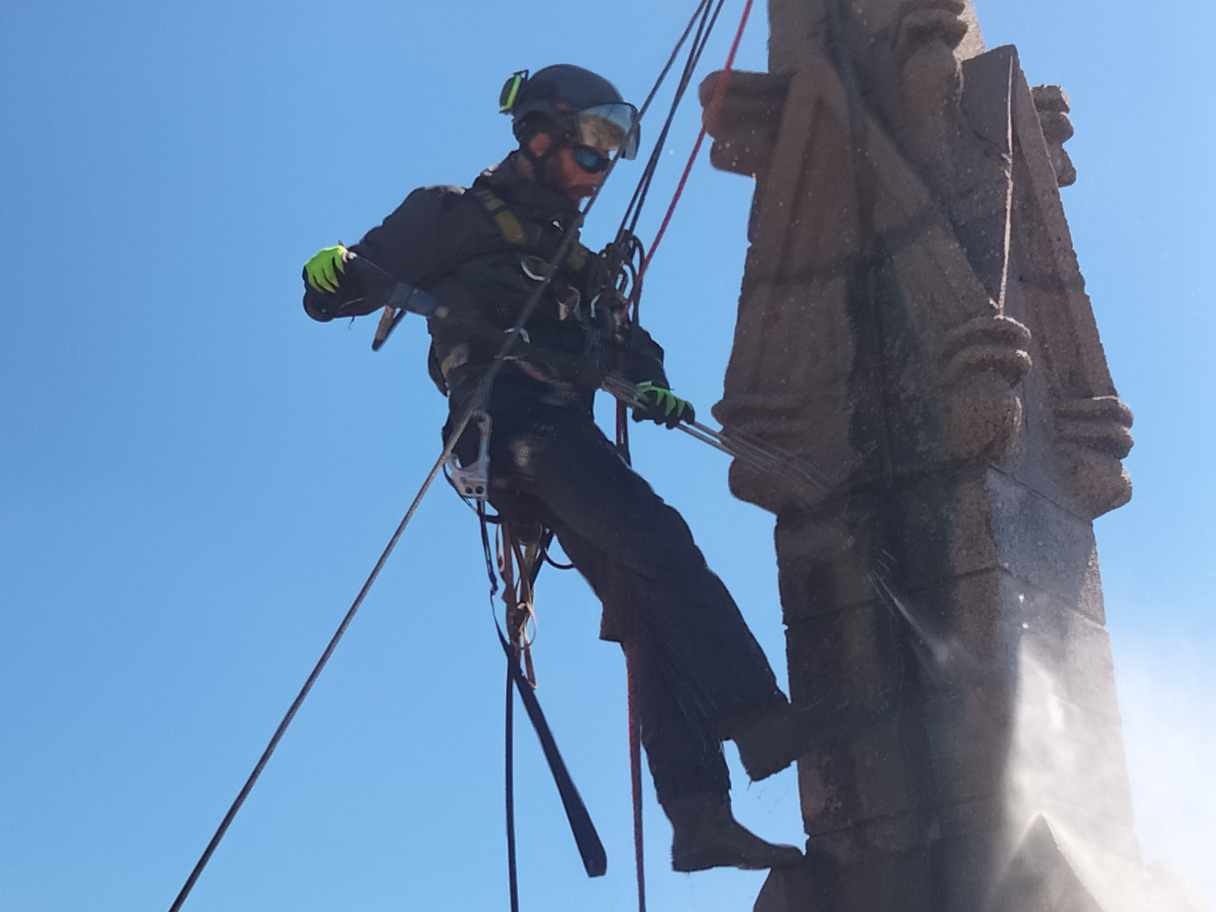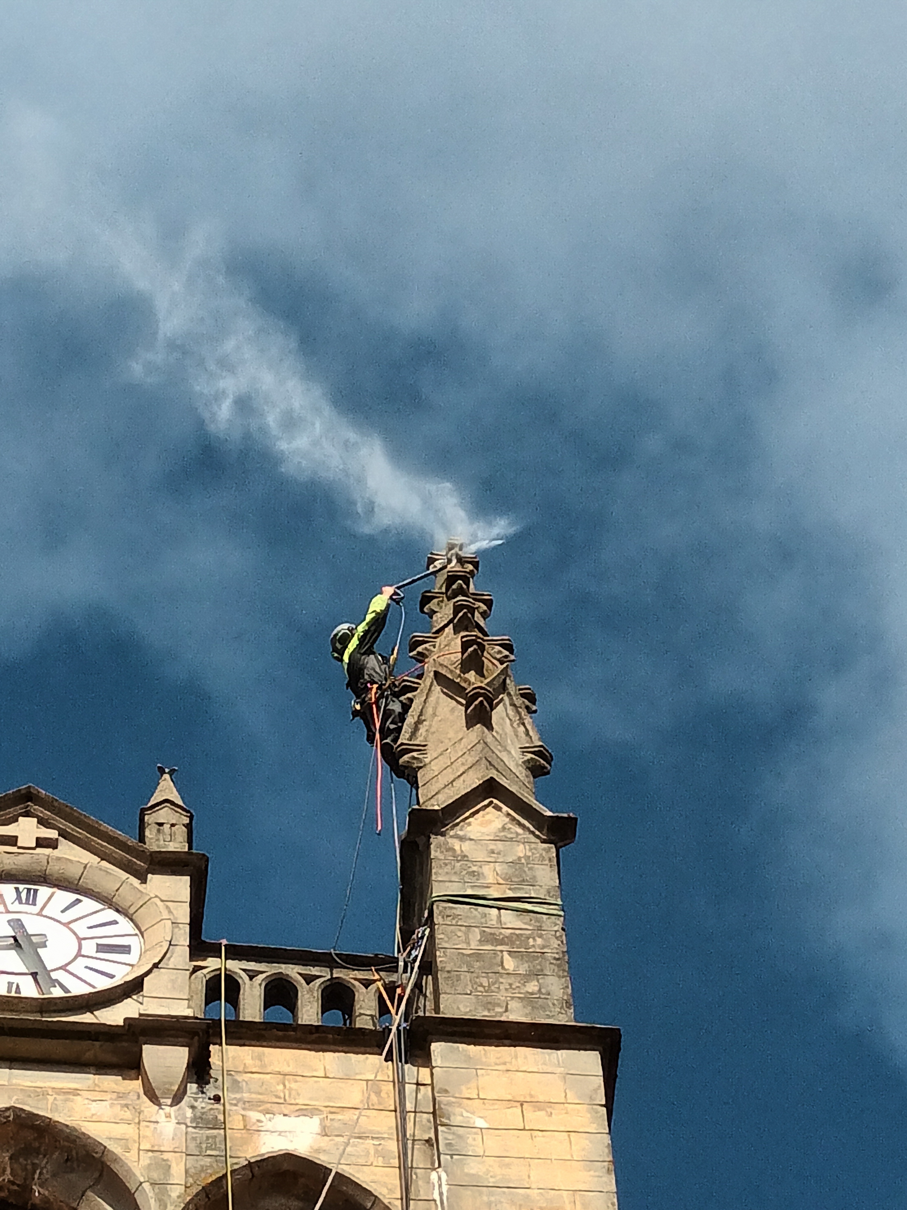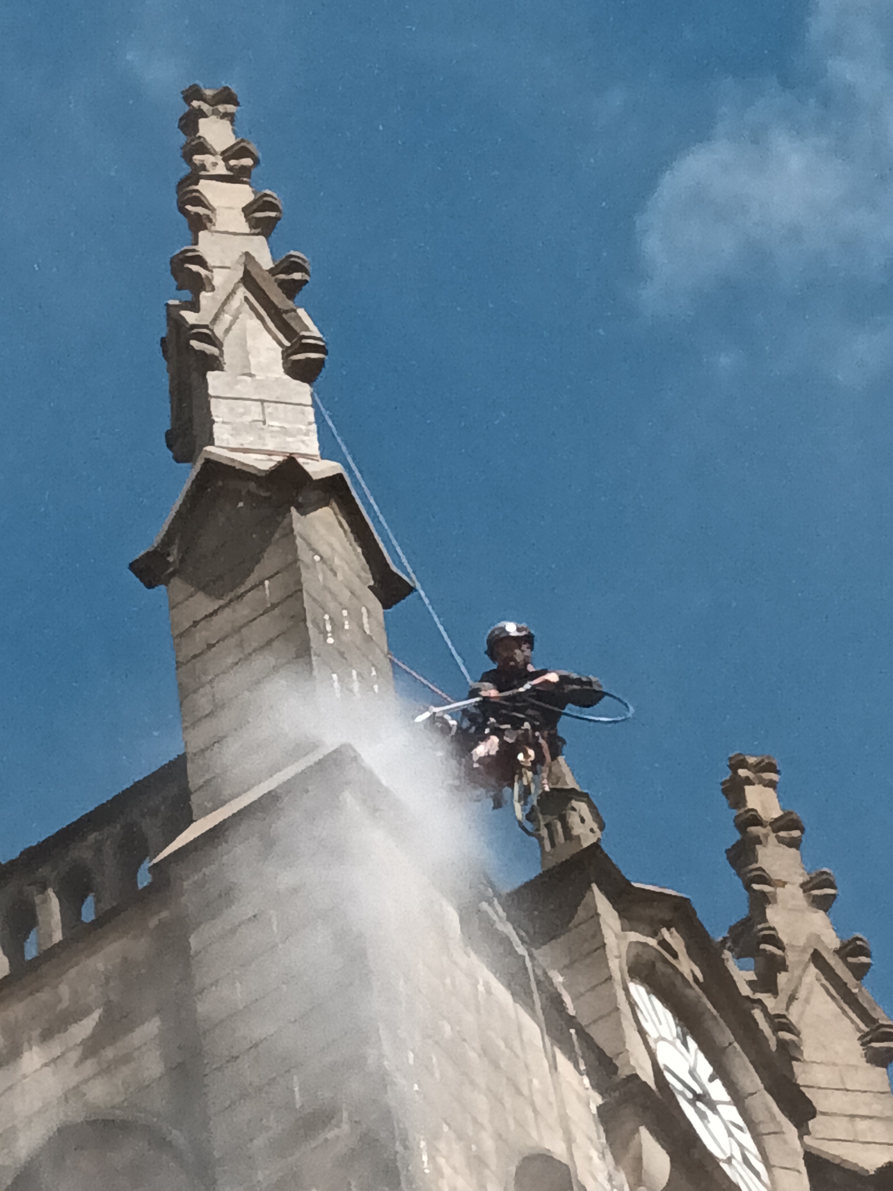 Un nettoyage haute pression s’avérait nécessaire dans des conditions périlleuses. Pour ce faire, cet exercice a été confié à trois spécialistes disposant des compétences requises, José Macel de la société T.S.C (Travaux Sur Cordes) basée à Coutouvre, son fils Benjamin et Yohan Bellée domicilié sur la commune.